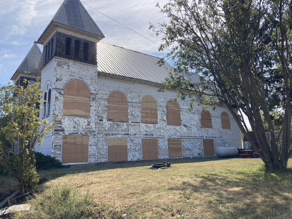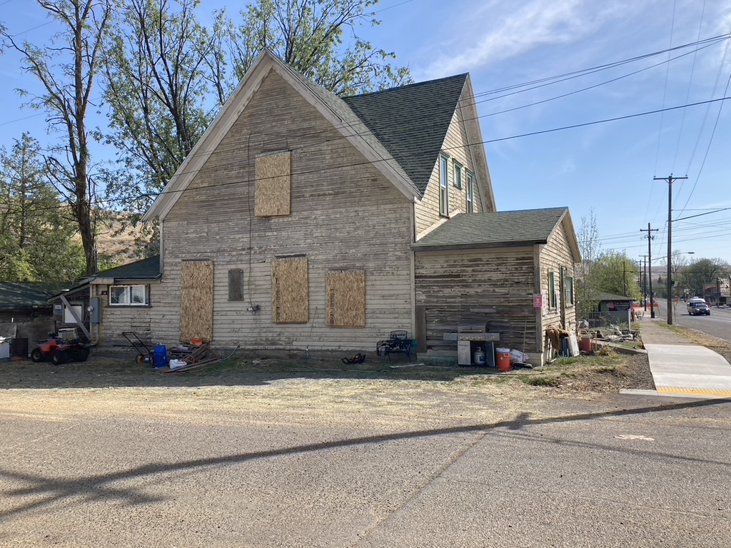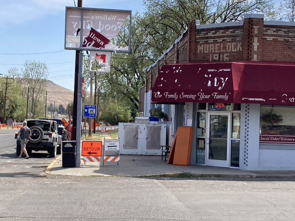 As we drove through the tiny town of Wallowa, it looked very dry and dusty. The trees looked like they had lost most of their leaves and it was only August. We noticed as we drove slowly through the highway in the middle of town, windows were  boarded up. All of the buildings on the west side had plywood on the windows. Was it because of the hot summer western sun? I wondered. Crossing the bridge, over the Wallowa River, I noticed a good sized tree had fallen into the water. Everything looked messy, leaves scattered everywhere. Big branches covered the ground. Not the usual green summery view near the river banks.