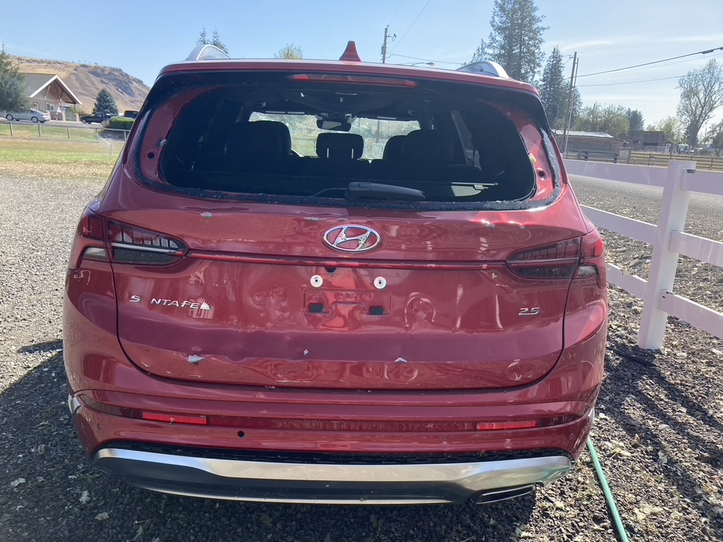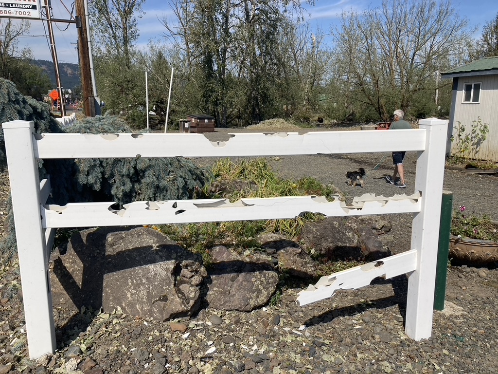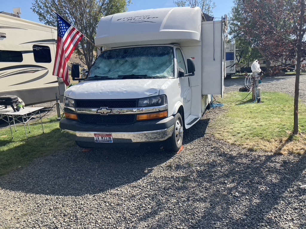 As we drove through the campground, there were tarps covering most of the RV roofs, the vehicle windshields were smashed as though a giant fist hit them.