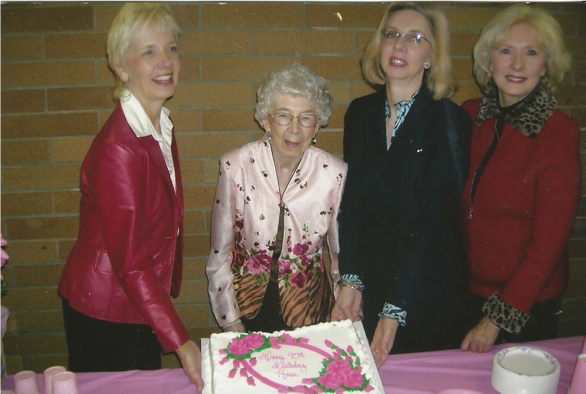 - Mom celebrating 90. Left to right: Shirley, Rose, Betsy, & Eileen